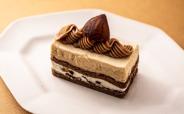 香り高いココアシートで、生クリームと刻んだ栗、チョコをサンド。ラム酒香るマロンムースと、なめらかなフランス栗のクリームを重ねました。