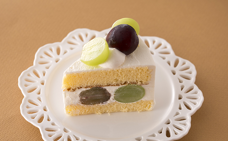 北海道産生クリーム3種をブレンドし、ふわふわのスポンジとで絹のような口どけを追求。旬のフルーツを飾った季節限定ショートケーキ。現在はぶどうとマスカットを使用しています。