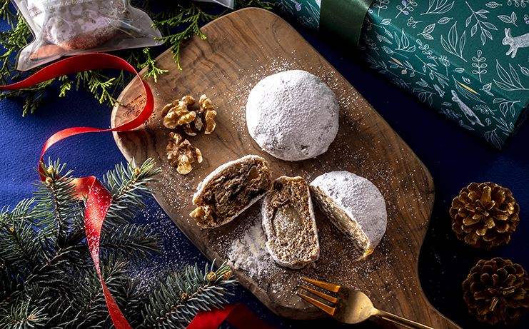 たっぷりのフルーツやアーモンド、くるみ、スパイスと上質なバターを練り込んだ生地で、特製のアーモンドペースト(マジパンローマッセ)を包み込み、丁寧に焼き上げたシュトーレンを程よいサイズの個包装に。